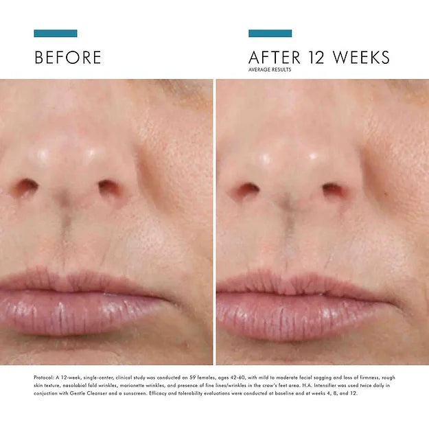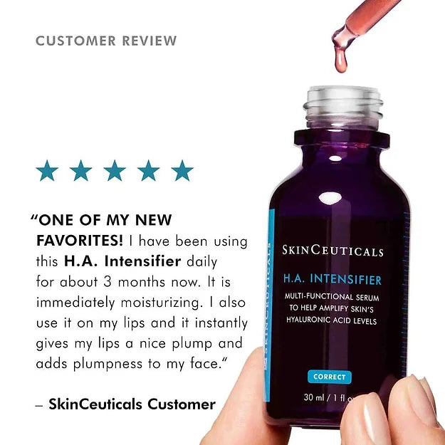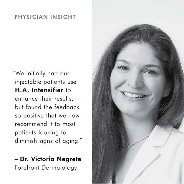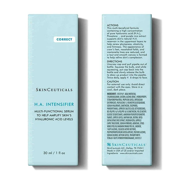 H.A. Intensifier is a multi-beneficial corrective serum proven to amplify the skin’s hyaluronic acid levels by 30%. This unique formulation contains a high concentration of pure hyaluronic acid, Proxylane™, and botanical extracts of licorice root and purple rice to support the skin’s hyaluronic acid levels and deliver surface hydration, helping to improve the visible appearance of firmness, smoothness, and facial plumpness. This hyaluronic acid serum may be used as part of a home skincare regimen after dermal fillers; always consult with your physician for individual at-home advice.