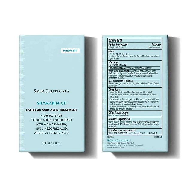 Silymarin CF is a breakthrough vitamin C serum for oily and blemish-prone skin that combines 0.5% silymarin (milk thistle extract), 15% l-ascorbic acid, 0.5% ferulic acid, and 0.5% salicylic acid to help prevent oil oxidation that can lead to breakouts and visible signs of aging. This oil-free formula is clinically demonstrated to reduce oil oxidation by up to 76%, as well as reduce oiliness, refine skin texture, and visibly improve skin clarity and fine lines.